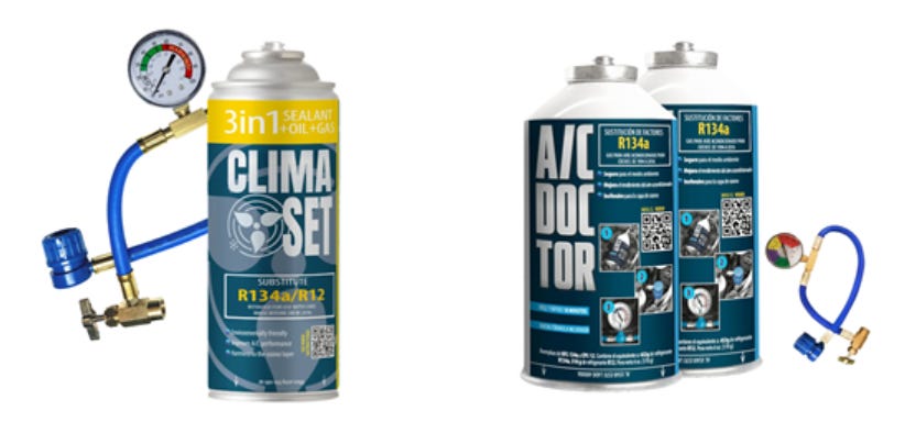 The main European brands are EasyKlima, Climaset, Cool5, and Alaska Refrigerants. There are also a few others like FixClima which are only active in 1 specific country and where it’s not always clear if they are a stand-alone company or if they are made by 1 of the companies above, as a private label brand for a local retailer.