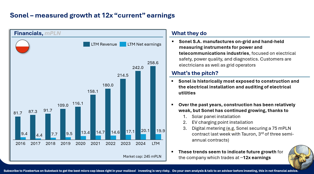 Going of the right, we see Sonel, a compounder benefiting from EV, digitization and other electrification trends that prints one excellent year after another: