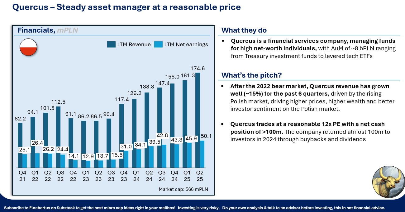 Next up, we have asset manager Quercus, arguably joining the group thanks to the Polish bull market driving up assets and therefore income: