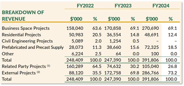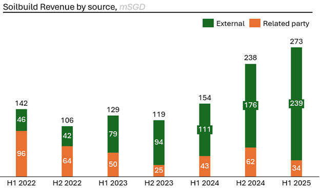Related Party Projects are becoming a smaller part of the business. These are Projects where Soilbuild Corp/REIT (the historical parent) is the customer. So, they are building for their own property management business in this case. This further declined to 12% in H1 2025.