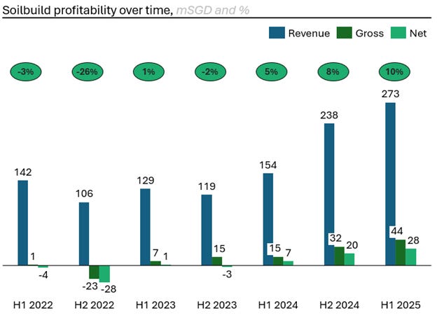 The bookings/awards in the chart above exclude a single huge one-off award of 647 mSGD in H1 2024, for the construction of a Supply Chain Hub at the Tuas port, for the Port Authority of Singapore (PSA). We have excluded this massive win, to show that even without it, Soilbuild is a nicely growing business.