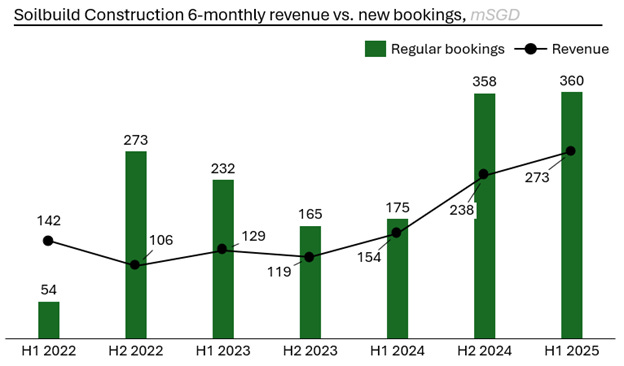 The company has just reported 273m in H1 2025 revenue (+77%), and 28m in H1 2025 earnings (+280%). We think this growth is likely to continue in the coming years, as Soilbuild had H1 2025 new bookings of 360m, growing their order book to ~1.2B, covering about 2 years of forward revenue growth, with more new bookings (award wins) continuing to come in.