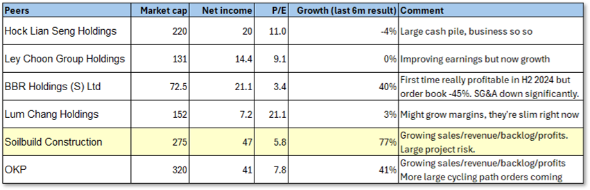 Comparative (small cap) analysis for a company like Soilbuild looks like the table below. We find some companies that are much more expensive for no obvious reason, and we find companies that look much cheaper/better. Reading the annual report for those in the second group however reveals some issues going beyond valuation. Each of the companies have their own specific capabilities and niches, making a comparison difficult.