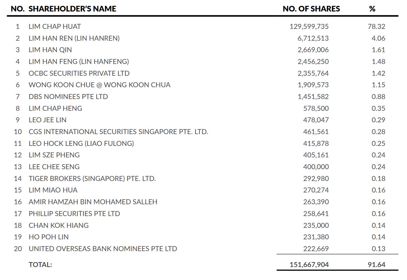 Soilbuild is majority owned by chairman Lim Chap Huat. The Lim family together owns ~85% of the company. Soilbuild today has no options/warrants. Historical warrants expired in July 2024. Soilbuild did conduct a 10:1 share consolation in December 2024.